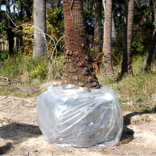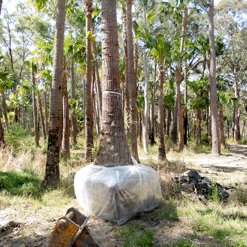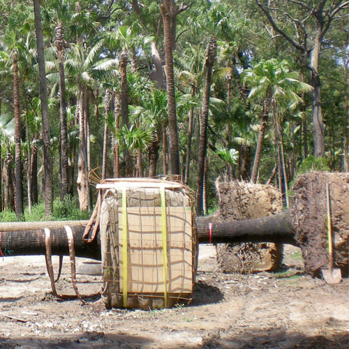 Palms are transported with heads trimmed. The average size of a root ball is 900 x 900 x 800mm and wrapped in a plastic sleeve.